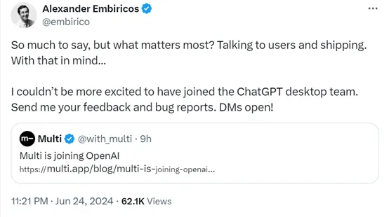 Multi的联合创始人Alexander表示,非常兴奋加入ChatGPT的桌面团队,接下来将于OpenAI一起打造更好的功能。