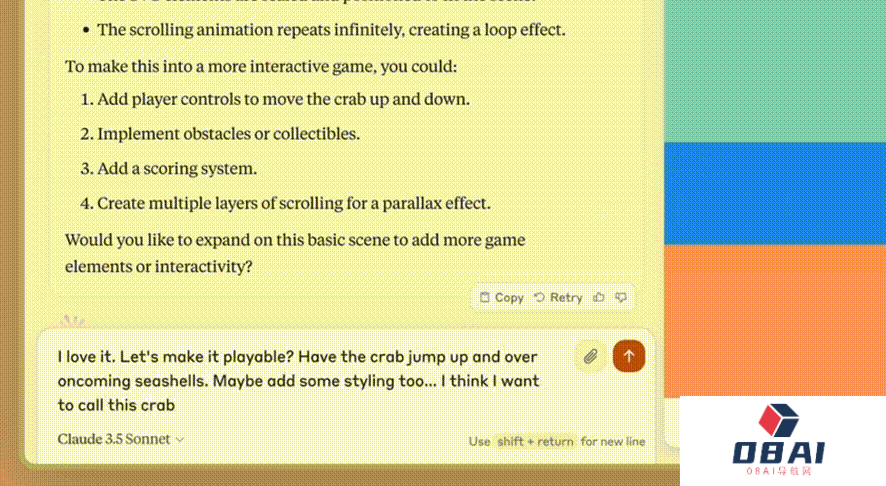 比如想要创建一个交互式的游戏界面,你很难在一次对话中描述清楚所有的功能与需求。即使描述清楚了,以生成模型目前的能力,未必也能一次得到满意的结果。