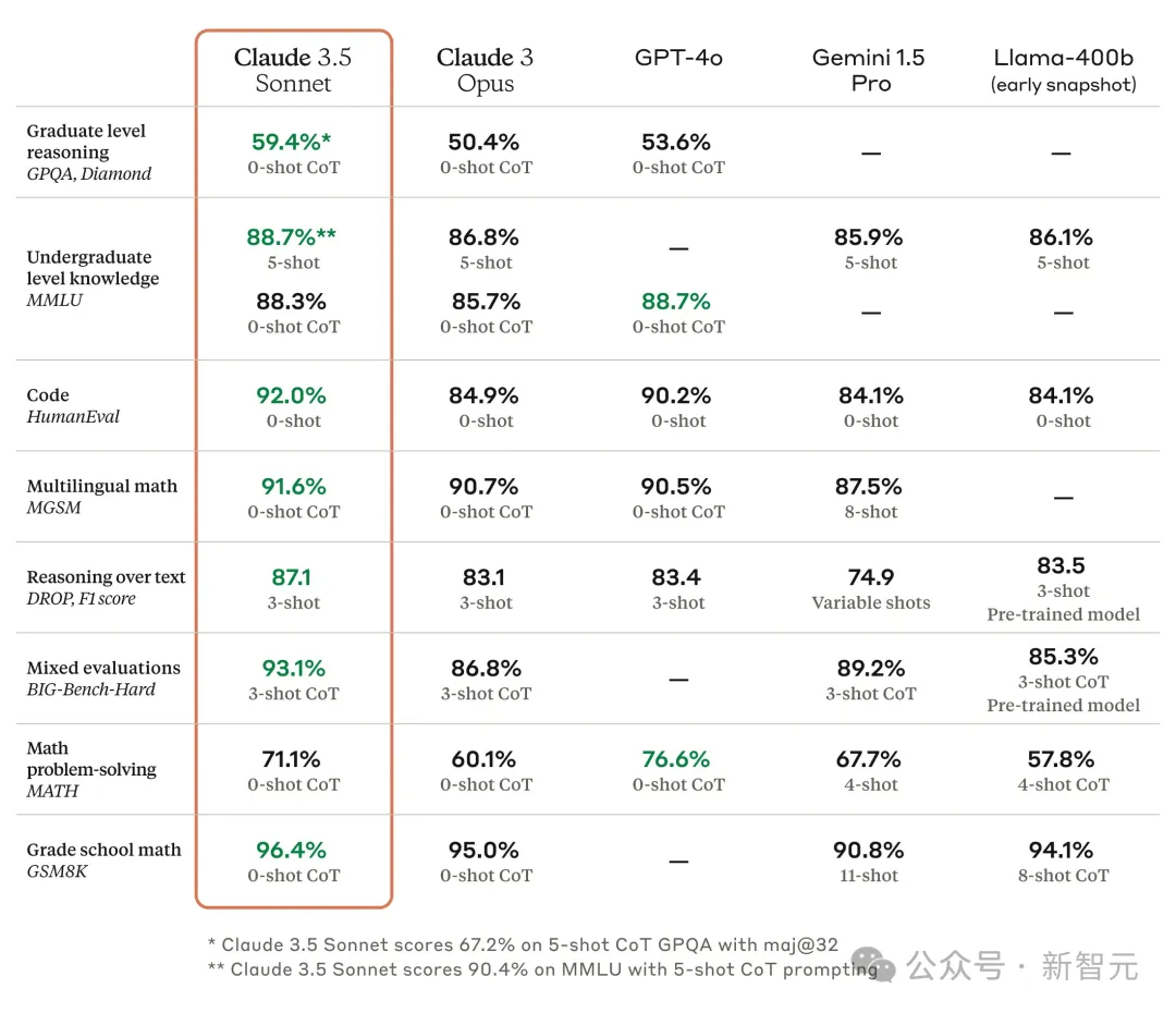 Claude 3.5 Sonnet虽然在零样本MATH和MMLU评测中小幅落后GPT-4o,但在研究生级推理(GPQA)、本科级知识(MMLU)和编码能力(HumanEval)上,毋庸置疑地刷新了SOTA——