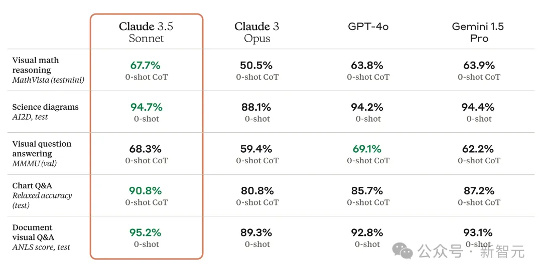 在视觉方面,Claude 3.5 Sonnet也是Anthropic迄今为止推出的最强大模型,不仅明显优于Claude 3 Opus和Gemini 1.5 Pro,而且在大部分测试中也都超过了GPT-4o。