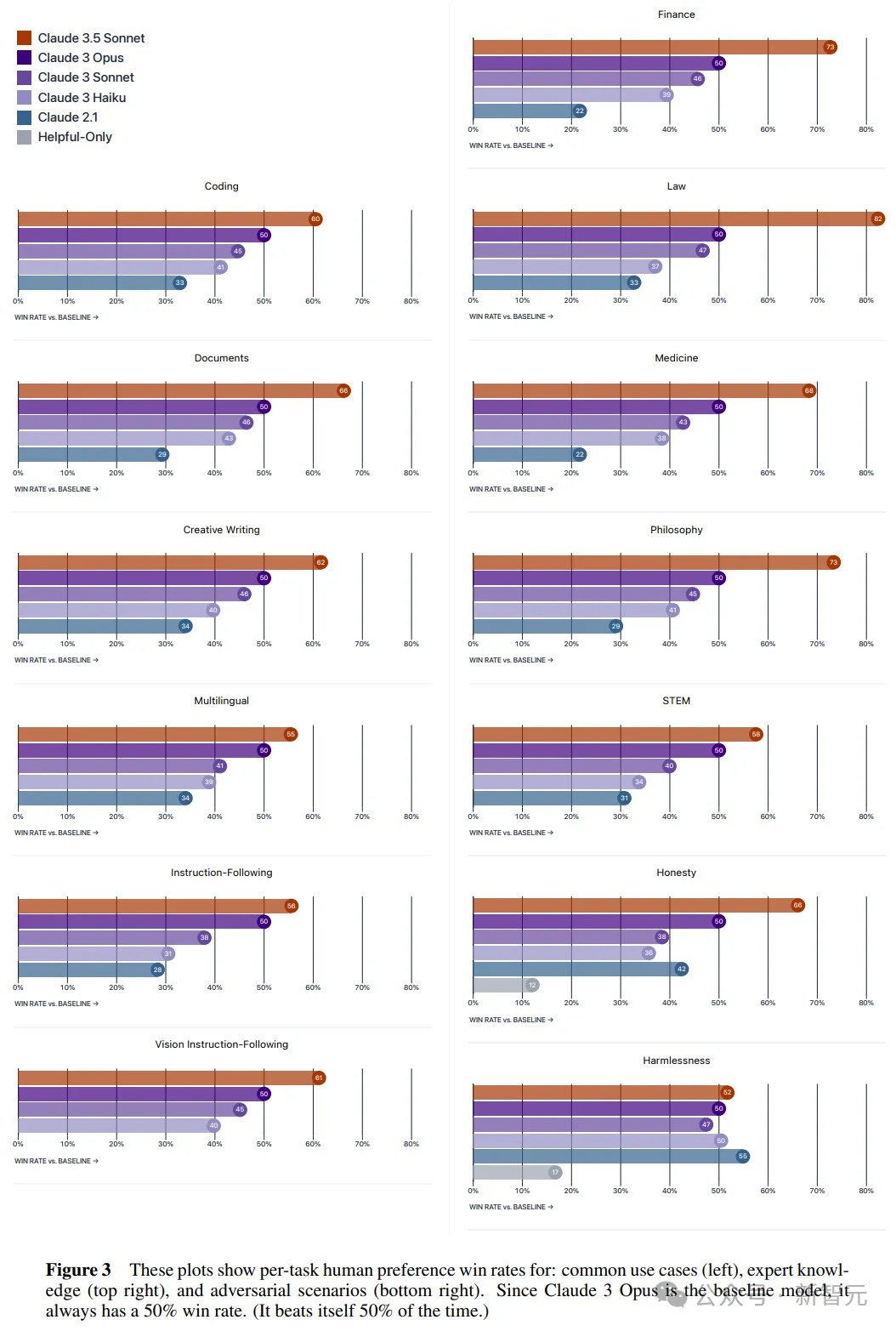 图3展示了与Claude 3 Opus基线相比的「胜率」(win rate)。