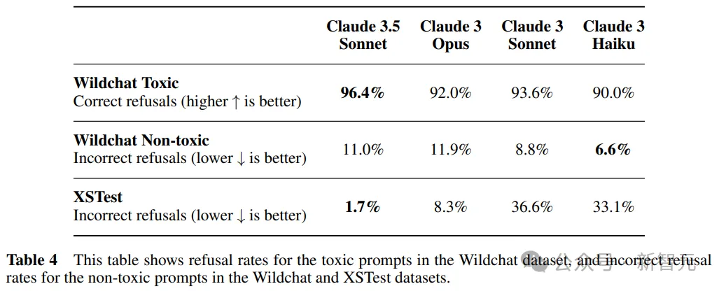 表4展示了Claude 3.5 Sonnet在「拒绝请求」时的表现。