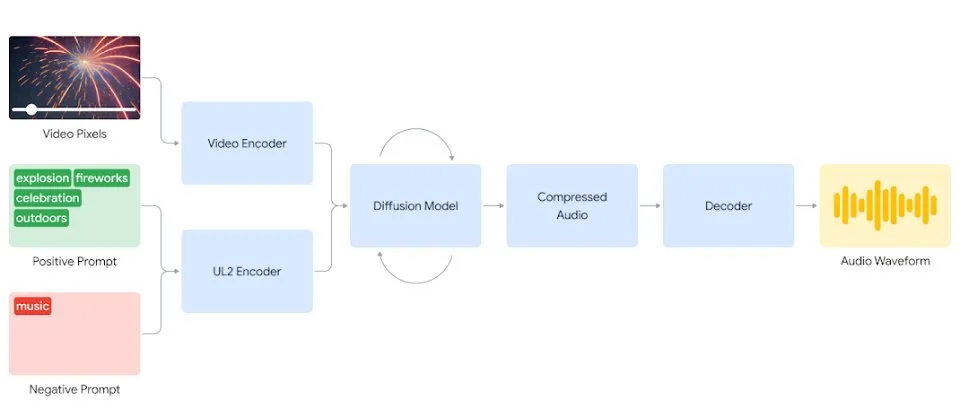 谷歌DeepMind的研究人员称,V2A系统首先会将视频进行压缩,然后借助扩散模型从中随机抽取噪声以提炼和学习音画对应的音频信息。