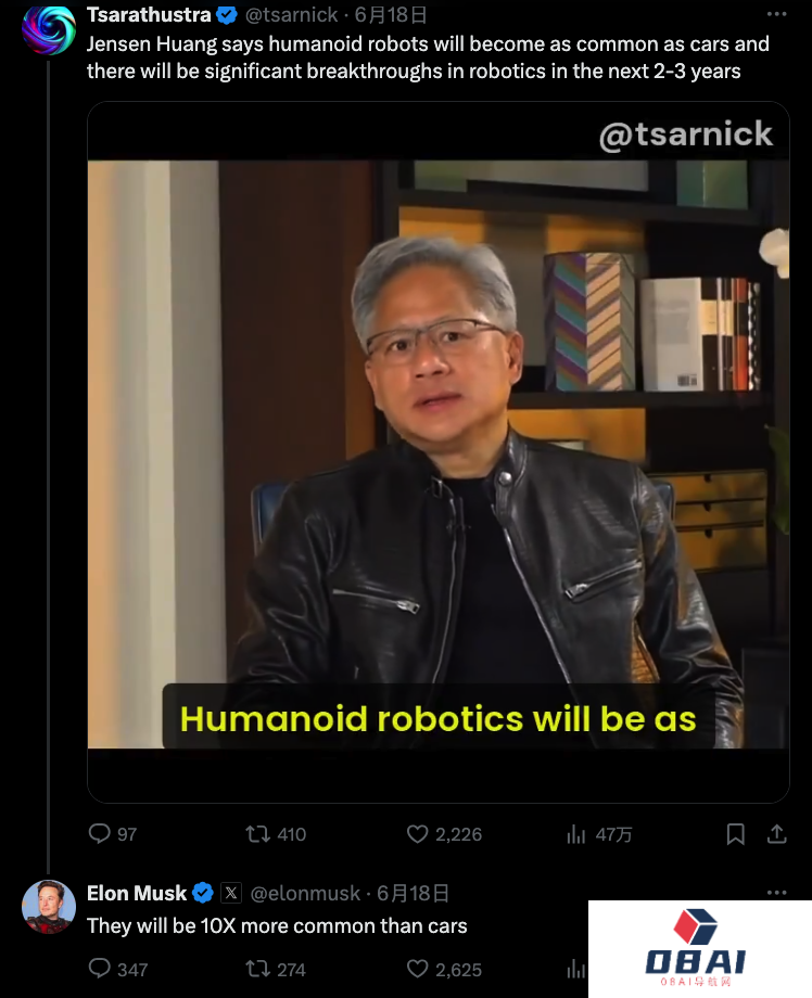 对于这则采访,特斯拉 CEO 马斯克在评论区留言回应:「人形机器人的普及程度将是汽车的 10 倍」。目前在人形机器人领域,马斯克的特斯拉位列行业的第一集团位置,并计划在 2025 年开始销售旗下的「擎天柱」机器人。