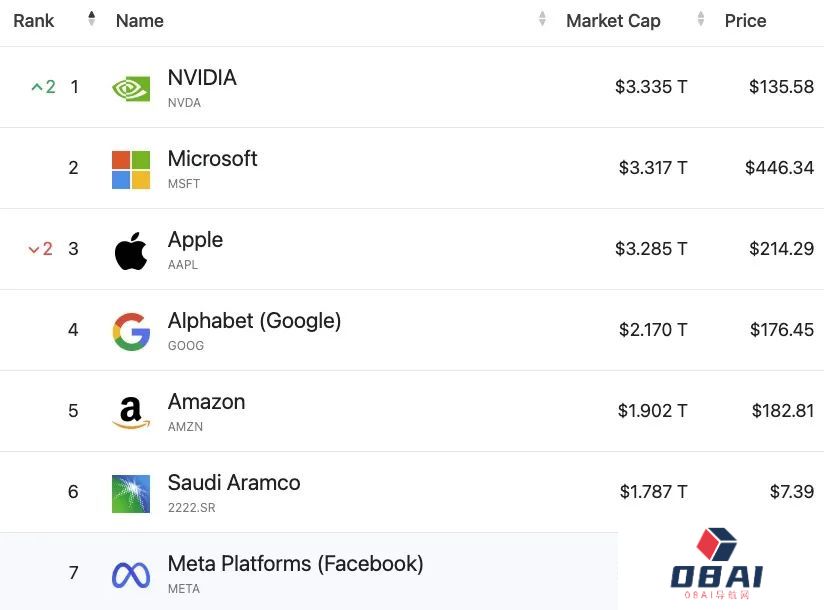 当地时间6月18日,美国芯片巨头英伟达的股票当日价格在午盘交易中上涨3.2%,使该公司的市值升至3.33万亿美元,而此前排名靠前的微软与苹果均出现不同程度下跌,因此一举成功超越微软公司,成为全球市值最高的上市企业。