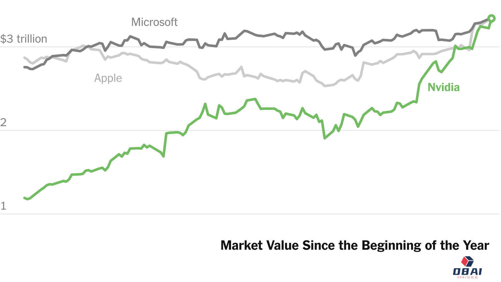 回忆去年的 6 月 13 日,英伟达市值刚刚跨越了 1 万亿美元大关,随后在今年 2 月 23 日,公司市值突破了 2 万亿美元。短短不到半年,在 6 月 5 日英伟达的市值来到了 3 万亿美元。目前美股市场拥有三家市值超过3万亿的企业,依据达成时间分别为:苹果、微软与英伟达。