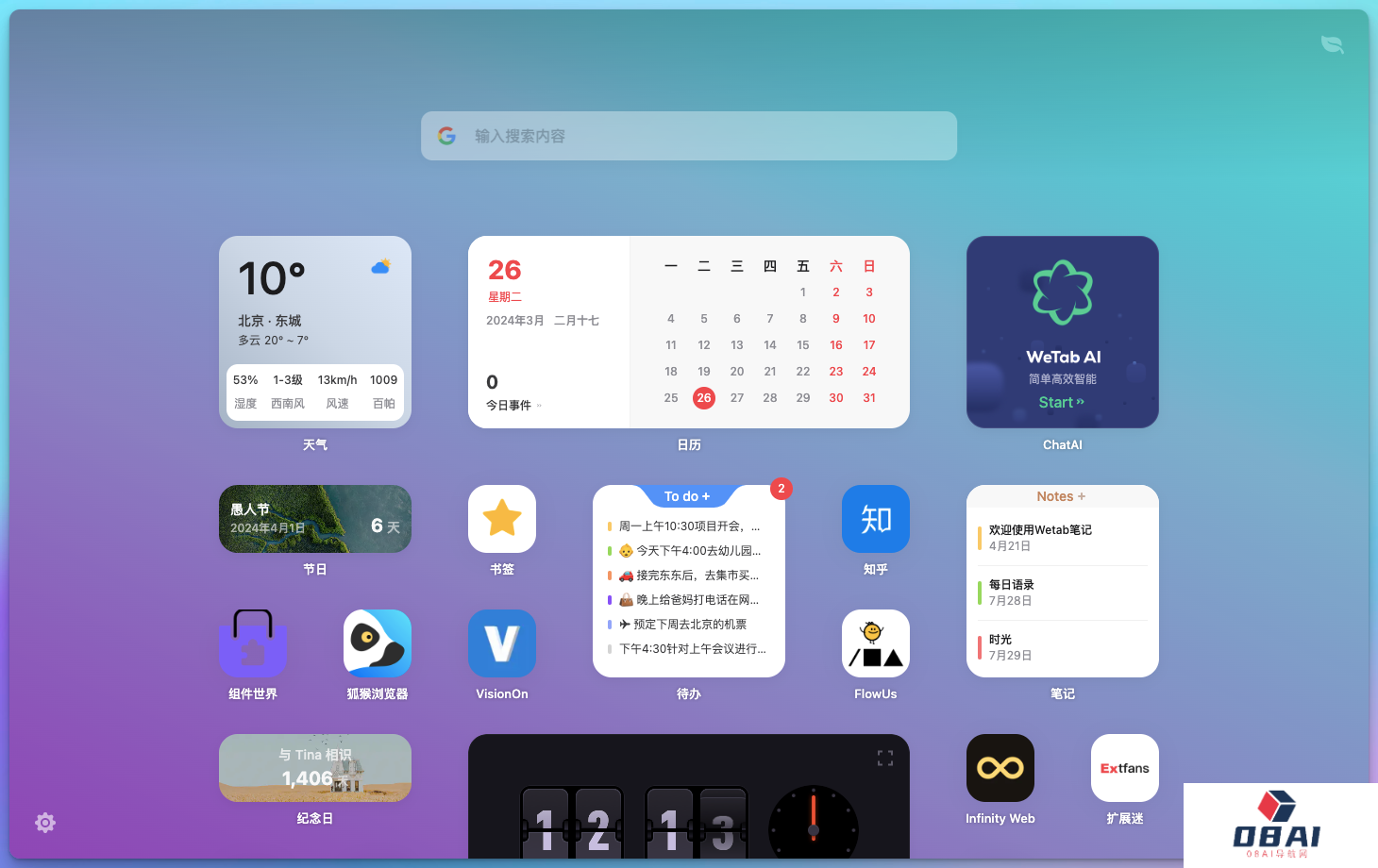 集成天气小组件、搜索栏、最常访问网站等小组件。