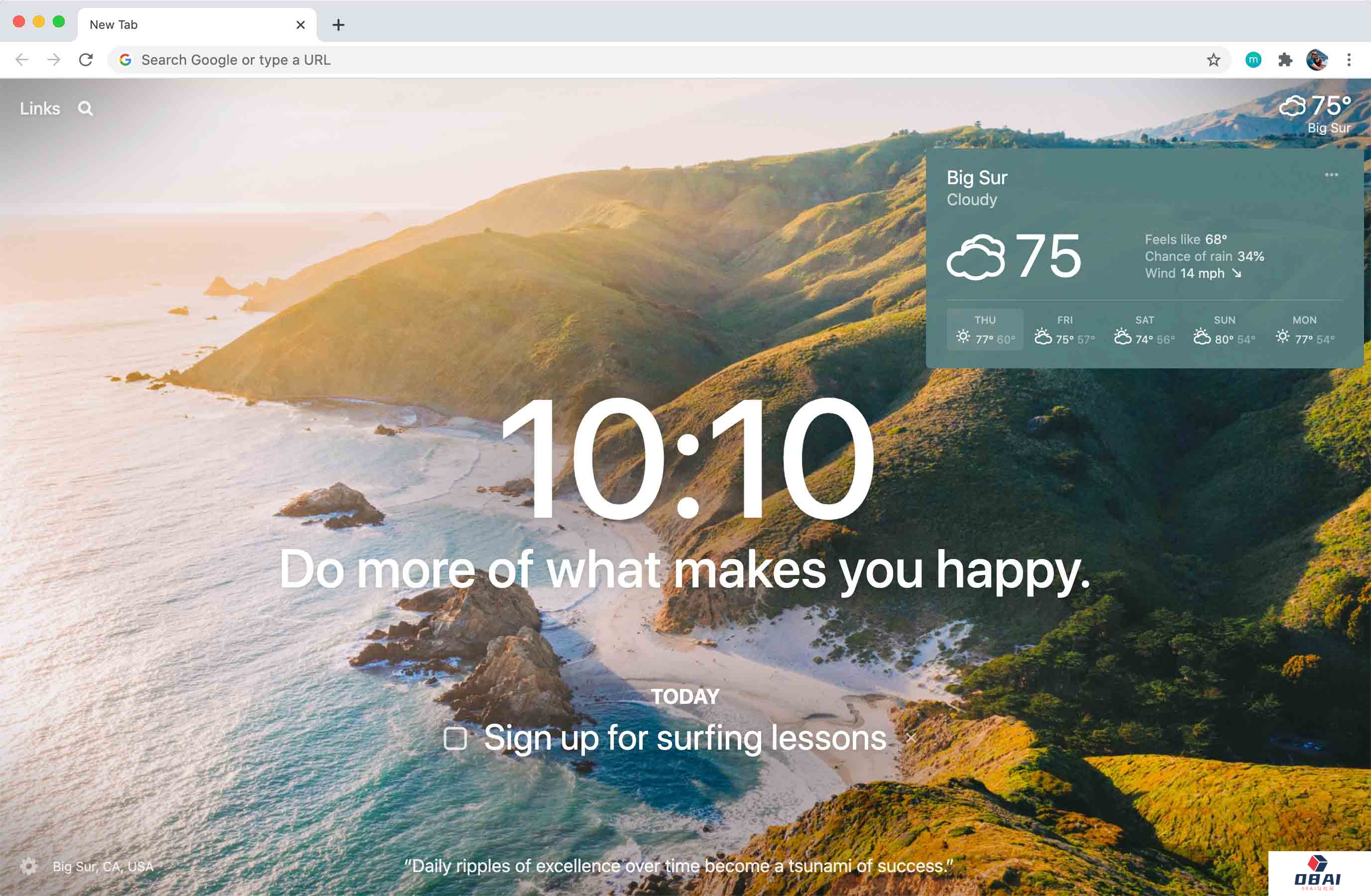 简介:Momentum Dash 是一个简洁而美观的浏览器扩展,旨在将新标签页转化为一个集中注意力、提高生产力和灵感激发于一身的仪表板。通过展示动人的图片、日常焦点、待办事项列表和励志语录,帮助用户保持专注和高效。