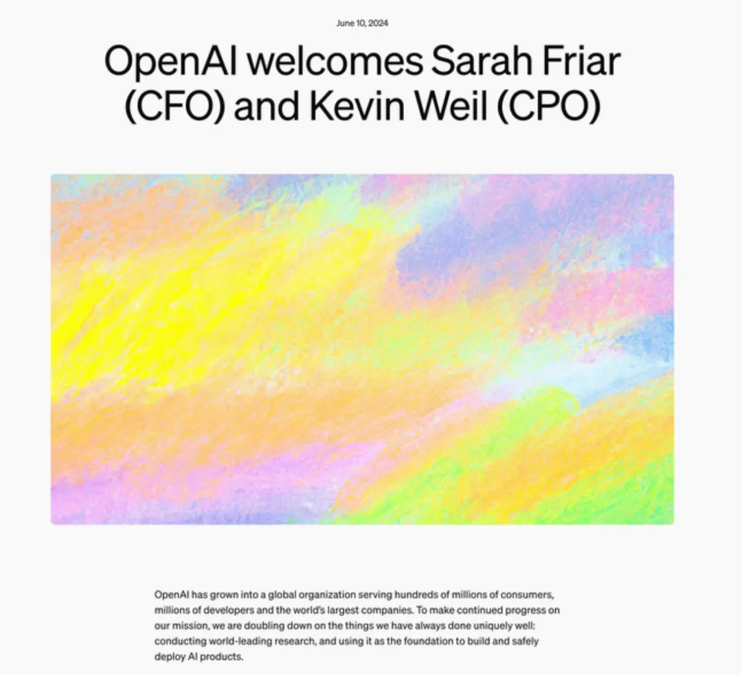 不久前,OpenAI 还聘请了新的 CFO(首席财务官)Sarah Friar 及 CPO(首席产品官)Kevin Weil,以加快其商业布局。OpenAI 官网上对这两人是这样介绍的: