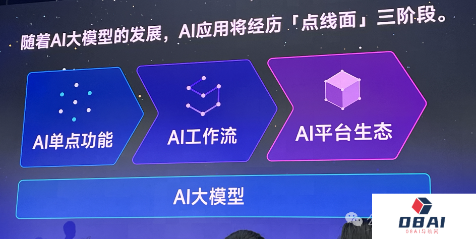 吴欣鸿表示,随着AI大模型的发展,AI应用将经历点、线、面三个阶段。