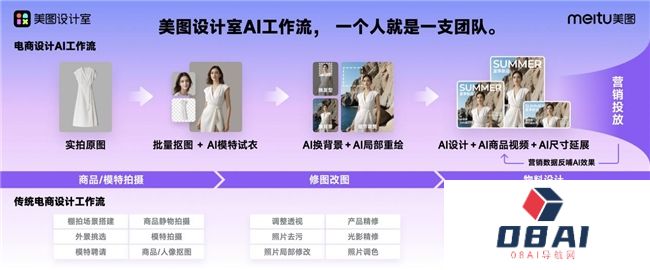 自2022年3月推出以来,美图设计室已累计服务近200万电商卖家。传统的电商设计工作流,一套物料从请模特,到商品棚拍、改图精修,多尺寸等,往往需要好几天的时间。通过美图设计室的“AI工作流”,一个人,一台手机,半小时就能轻松完成全套物料,“一个人就是一支设计团队”。