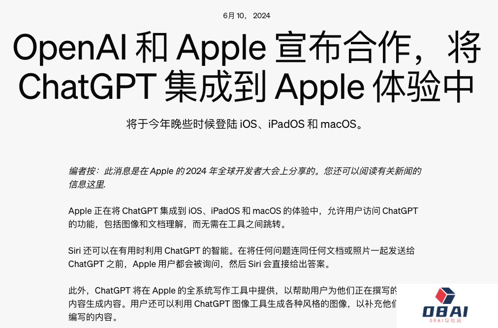 OpenAI 宣布与苹果达成合作伙伴关系,苹果正在将 ChatGPT 集成到 iOS、iPadOS 和 macOS 中的体验中,允许用户访问 ChatGPT 的多模态功能,而无需在各种软件工具之间跳转。