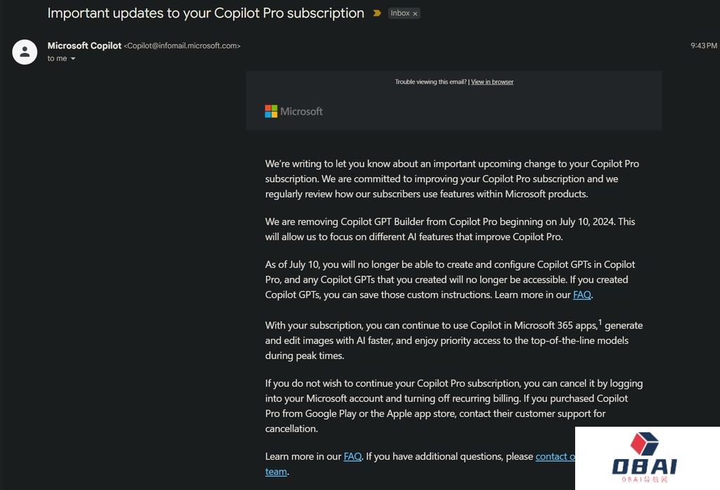 当地时间 6 月 10 日,微软发布公告称,将会在 Copilot Pro 服务中移除 GPT Builder(GPT应用创建工具)的相关功能,意味着订阅用户无法继续创建自己的 Copilot GPT。这一功能从推出测试到下线,也仅仅只有不到半年光景。