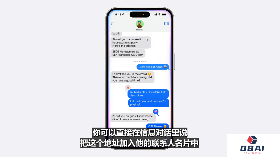 Siri得益于Apple Intelligence的加持,现在有了屏幕感知功能,比如朋友给你发了他们的新地址,你可以说“将此地址添加到他们的联系人卡片”,Siri 就会直接处理。