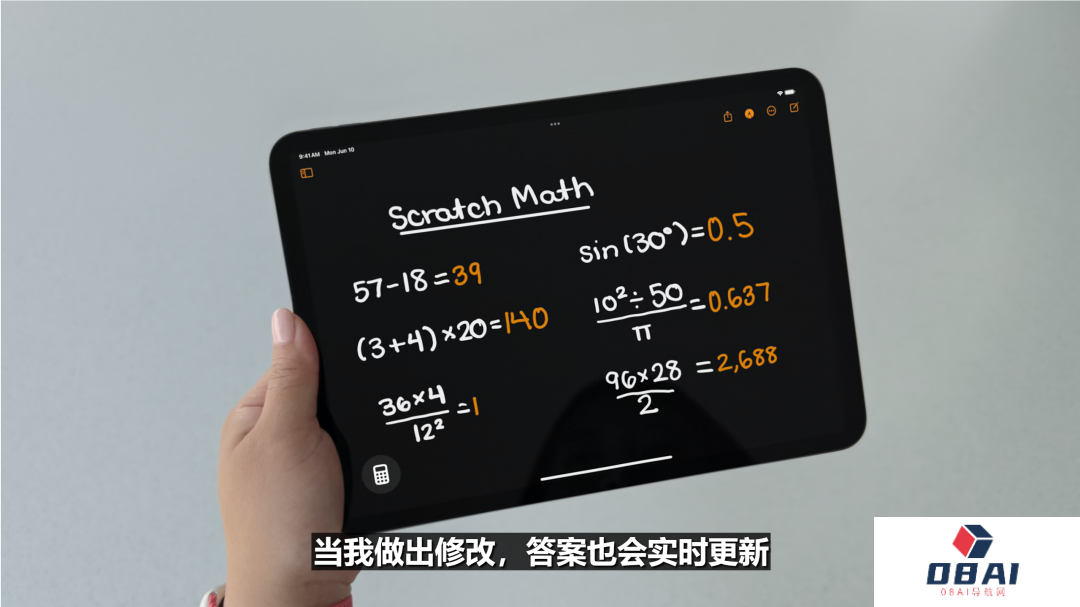 配上Apple Pencil,你就可以直接在计算器里面写公式,然后数学笔记会直接给你计算出结果实时展示出来,甚至还会模仿你的笔迹。