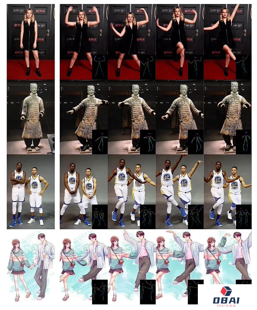 此外,这款视频生成模型具备较强的泛化能力,无论输入人物是什么年龄、服装,背景有多凌乱,动作参考视频的舞蹈如何复杂,都能生成出高质量的AI创作的动态视频。