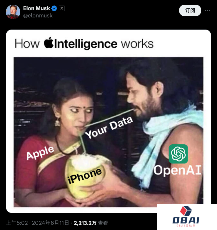 据彭博社当地时间6月10日报道,马斯克表示,如果OpenAI的GPT大模型被集成到苹果的操作系统中,将在公司全面禁止苹果的设备,称这种产品端的数据交换合作存在极高的安全风险。不仅如此,他还发布了一张梗图来总结他的观点。