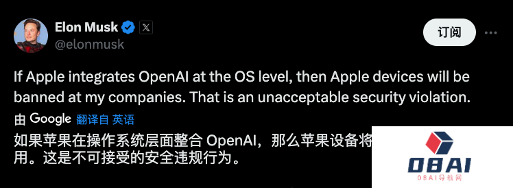 当地时间6月10日,马斯克在推特(X)发推文称,倘若苹果在操作系统层面集成OpenAI,他就将禁止其设备进入自己旗下的公司。
