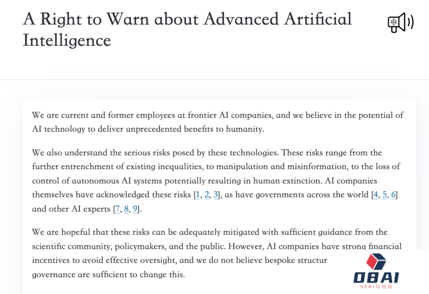 当地时间6月4日,OpenAI 与谷歌 DeepMind 员工联名对外发布了一封公开信,在信中,这些科研工作者对高级人工智能的潜在风险以及当前缺乏对人工智能科技公司的监管表示担忧。