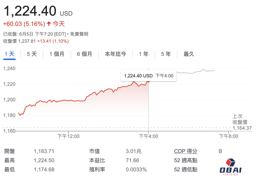 截至当日收盘,英伟达股价上涨 5.16%,报 1224.4 美元 / 股,市值为 3.01 万亿美元。这是英伟达首次突破 3 万亿美元大关,也成为继苹果和微软之后,第三家实现达成这一里程碑的科技公司。