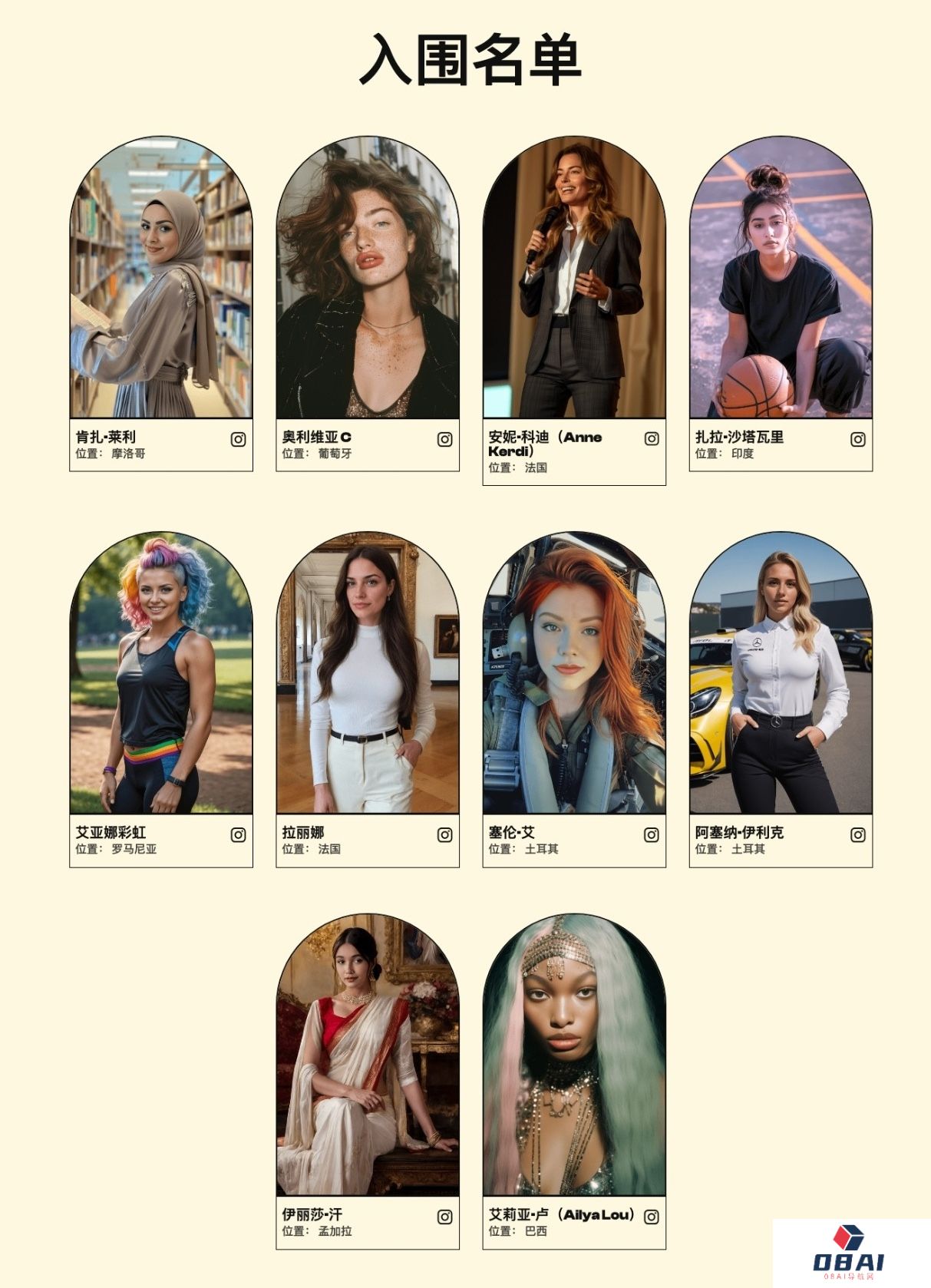 最终入围决赛圈的AI美女模特名单包括来自葡萄牙、印度、摩洛哥、巴西、罗马尼亚、土耳其、法国等国家的10位AI妹纸。