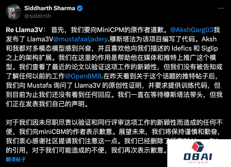 随后,斯坦福 Llama3-V 团队的两位作者 Siddharth Sharma 和 Aksh Garg 在推特(X)上就这一学术不端行为对面壁 MiniCPM 团队正式道歉, 表示会将 Llama3-V 模型悉数撤下。