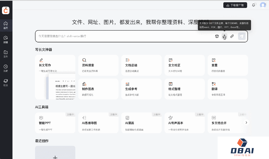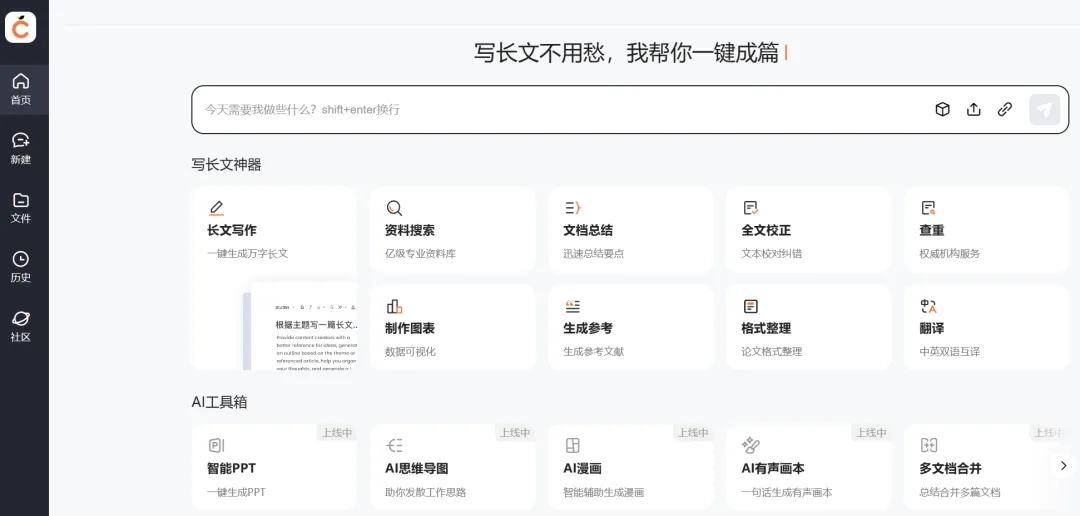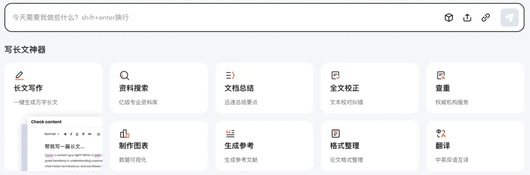 集资料搜索、长文写作、全文校正、图表生成等等于一身,一站式覆盖绝大部分的超长文本写作场景。