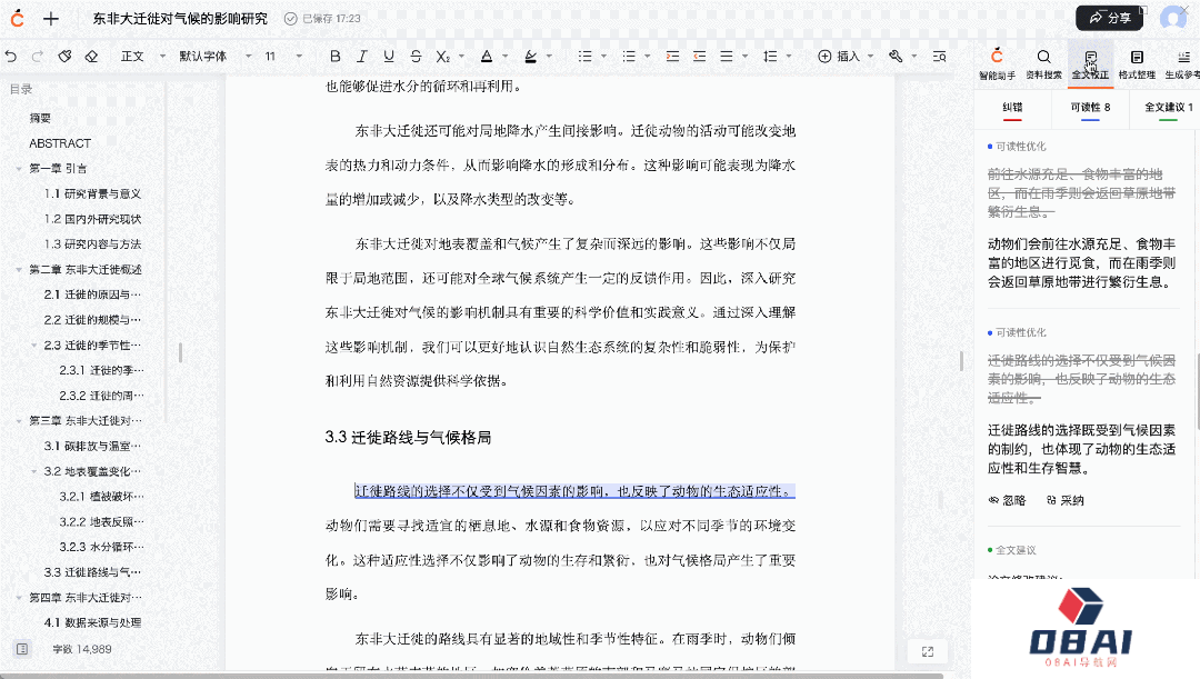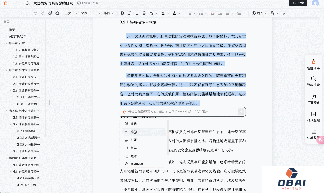之后,用户还可以进行深度编辑和整理,不仅能够润色、扩写续写、还提供一键全文校正、用户指定模版整理全文格式、参考源梳理和生成、智能编辑等功能。