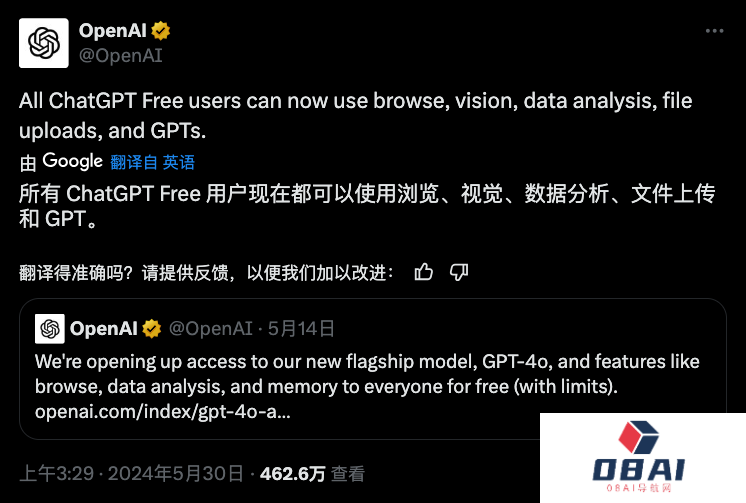 当地时间5月29日,OpenAI在推特(X)上发文宣布,免费使用ChatGPT的注册用户现在可以使用浏览、视觉理解、数据分析、文件上传和GPTs应用的相关功能。
