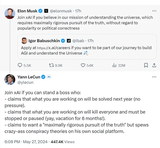 但很快遭到了图灵奖获得者、Meta首席科学家Yann LeCun的嘲讽,他表示,“你马斯克去年还因为OpenAI的产品不安全,进步太快而签署了一封上千名人的暂停大模型公开信,转头自己就融了一大笔钱搞的这么欢快了啊。”