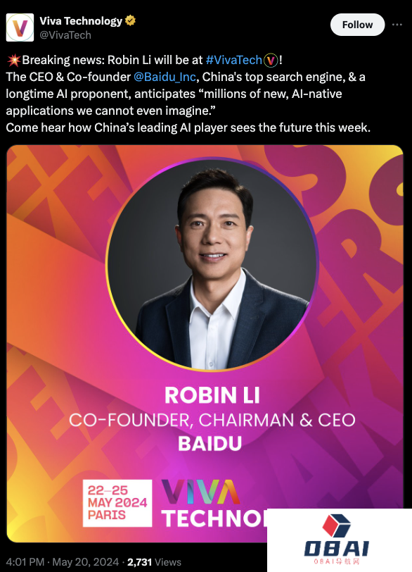 在大会开始之前,VivaTech官方预告了李彦宏将会出席该活动。而邀请李彦宏的原因是,他是“长期的AI项目支持者”和“中国的AI头号玩家”。