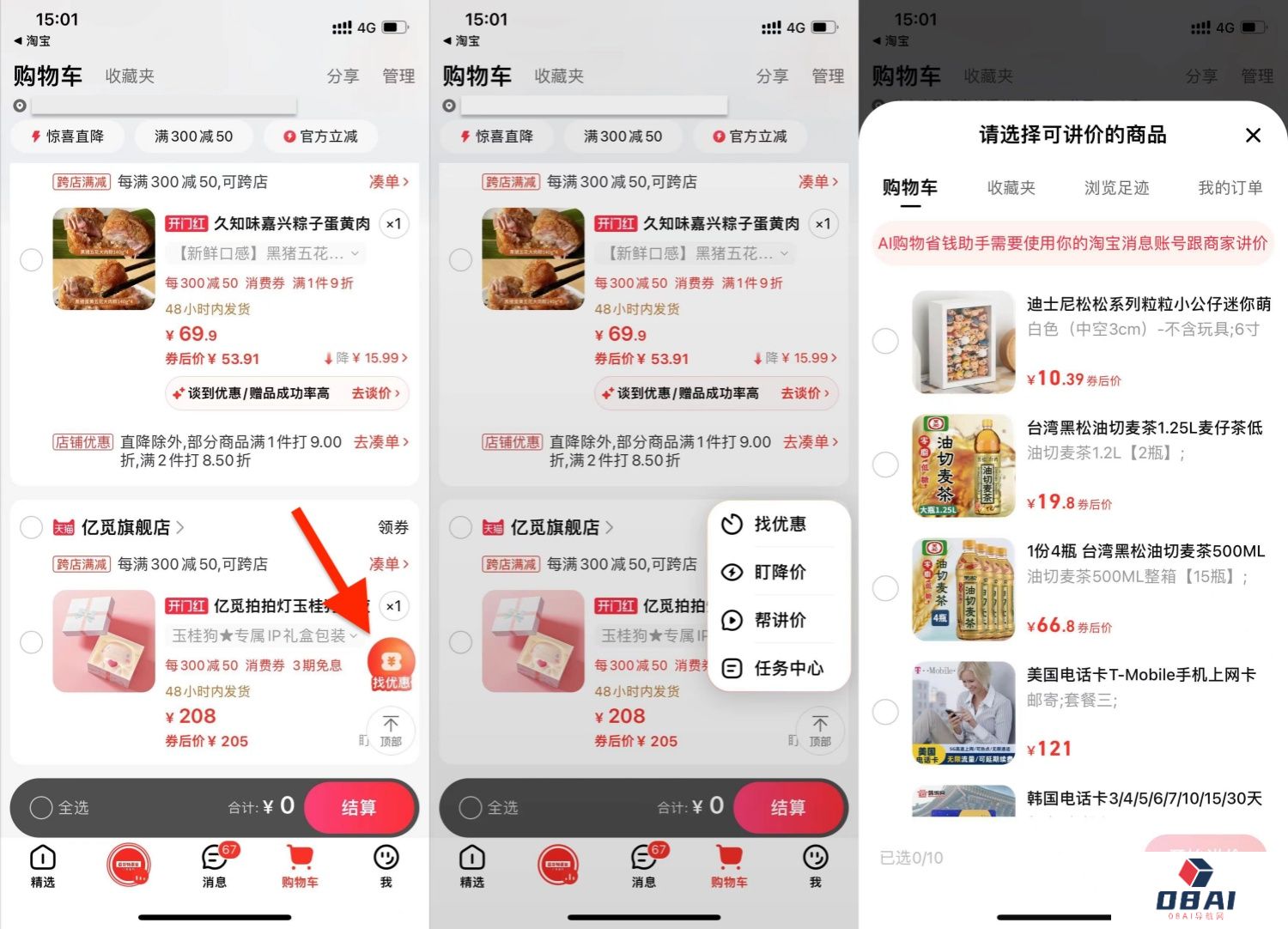 用户打开天猫APP,在?购物车界面点击右下角的「找优惠」入口,就可以看到「帮讲价」的选项。点击进入后,用户可以从购物车自行选择需要讲价的商品,并激活AI助手帮你砍价。