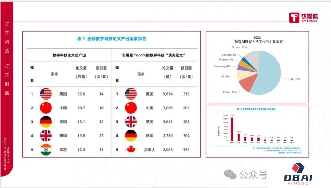 我们可以看这张图,里面可以看到,新一代全球数字科技领域,大多数都是以AI相关论文的,中国排名确实是很高的。但是到相关顶尖论文的数量,或者说被引用论文次数的数量,我们的排名就掉下来了。
