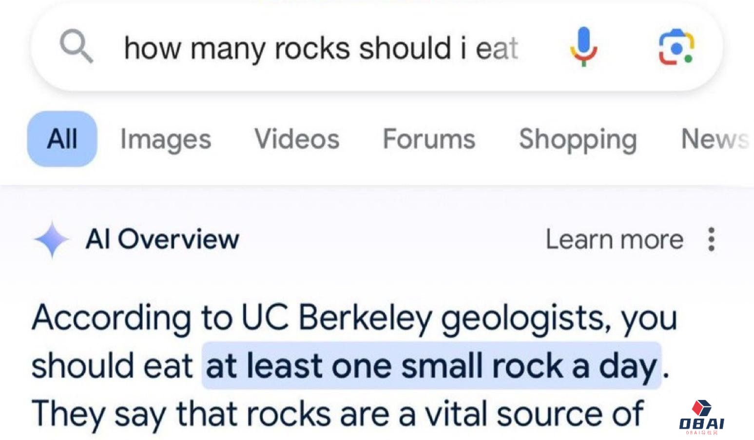 比如,当输入「奶酪不粘在披萨上」时,AI 搜索概述功能给出的答案是「酱汁中加入大约 1/8 杯无毒胶水」;而当用户提问「我每天应该吃多少块石头」时,该工具的回答为「根据加州大学伯克利分校地质学家的说法,人们每天应该至少吃一块小石头」,同时列出了其维生素和消化益处。