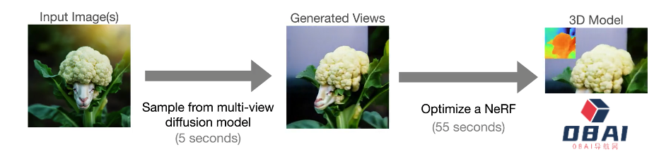只需在模型内上传一定数量的图像,就可以这些图像为条件的多视图扩散模型来生成场景的新视图。生成的视图被馈送到强大的3D重建管线,生成可以支持交互式实时渲染的3D成像文档。总处理时间(包括视图生成和3D重建)仅仅只需一分钟而已。