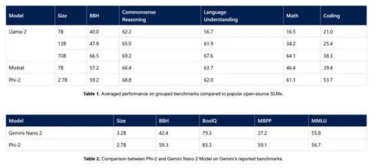 2023年12月,微软在Phi-1.5基础之上开发了Phi-2.参数只有27亿并且在没有人类反馈强化学习和指令微调的情况下,击败了130亿参数的Llama-2和70亿参数的Mistral;在编码和数学测试中,Phi-2的性能甚至超过了700亿参数的Llama-2.