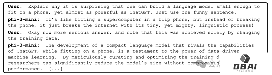 在技术报告中还玩了一把花活,让Phi-3-mini自己解释为什么构建小到手机能跑的模型很令人惊叹。