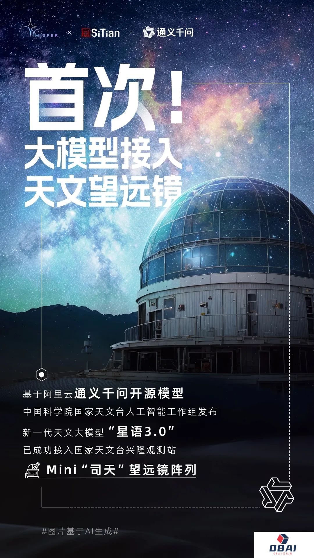 4 月 14 日,中国科学院国家天文台人工智能工作组发布新一代天文大模型 ——“星语 3.0”。据悉,“星语 3.0”基于阿里云通义千问开源模型打造,目前已成功接入国家天文台兴隆观测站望远镜阵列 —— Mini“司天”。