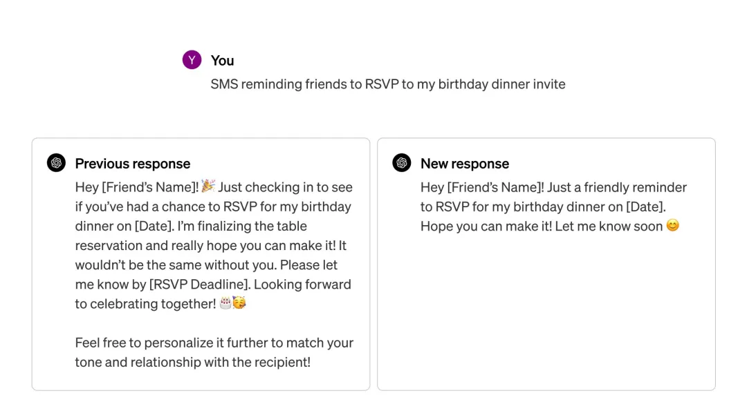 举个例子,当你需要发送短信提醒朋友回复生日晚宴的邀请时,以往GPT版本会像莎士比亚一样提供满满的情绪价值,虽然情感丰富,但也显得絮絮叨叨过于装X。