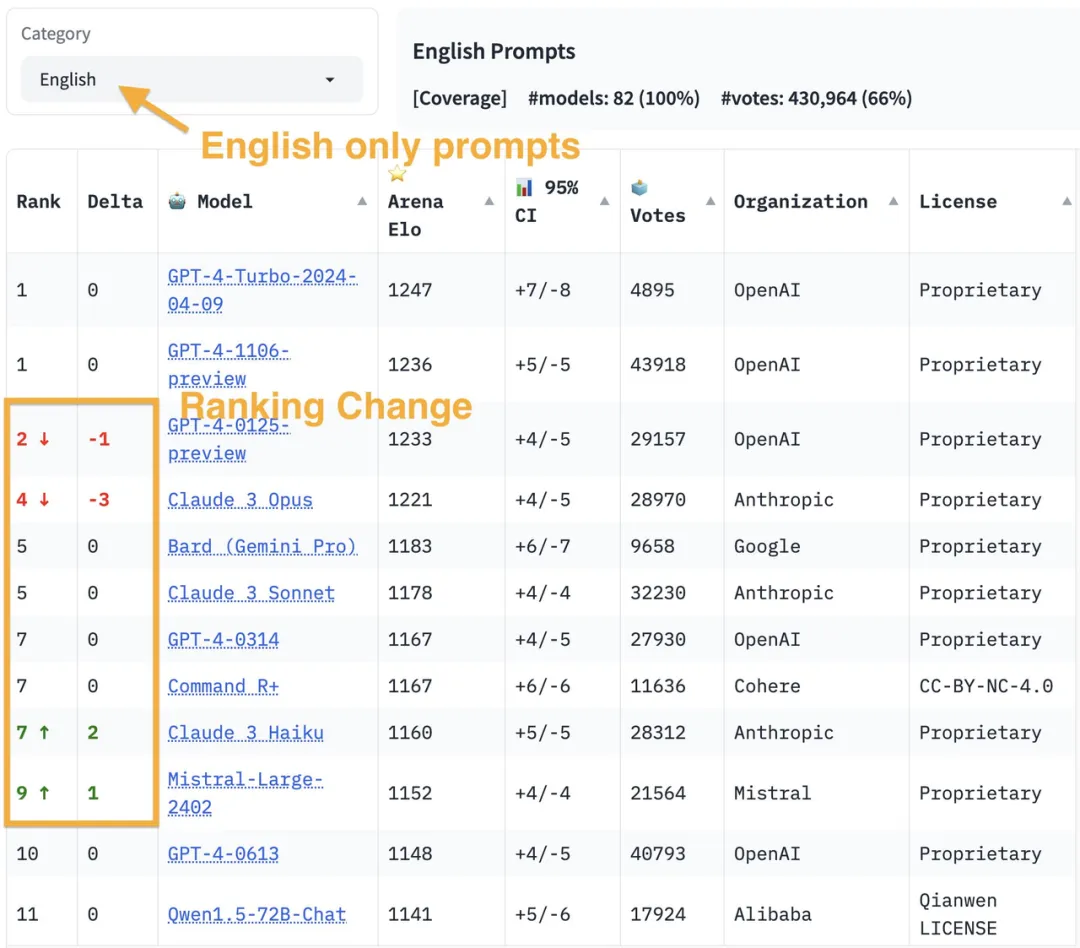 根据「大模型竞技场」排行榜,GPT-4 Turbo在英文Prompt提示词的输出能力上依然是“遥遥领先”的,但在切换成中文(Chinese)之后,就显得稍有力不从心,稍逊于Claude-3 Opus。