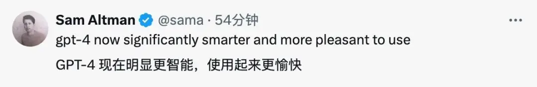 OpenAI CEO奥特曼也同步发布了新版模型的宣传话术。他表示「GPT-4现在明显更聪明,使用起来也更愉悦了」。
