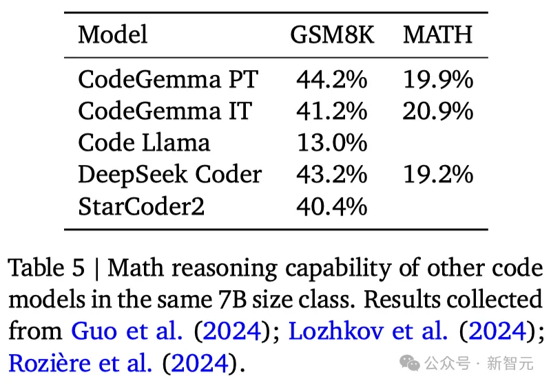 进一步地,如表5所示,CodeGemma在数学推理方面,相比同等规模的模型有着更出色的表现。