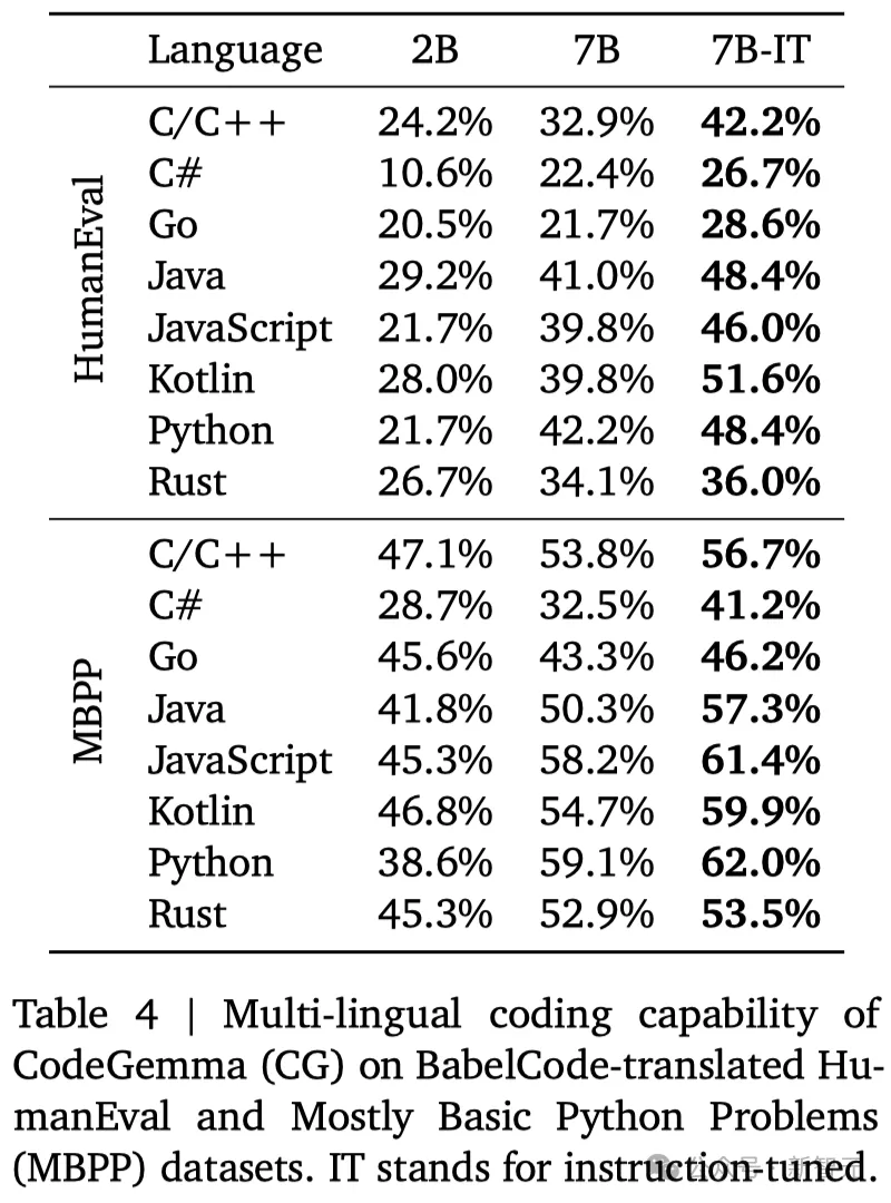 可以看到,CodeGemma同样有着Gemma基础模型的自然语言处理能力,其PT和IT版本在性能上均优于Mistral 7B和Llama2 13B——分别领先了7.2%和19.1%。