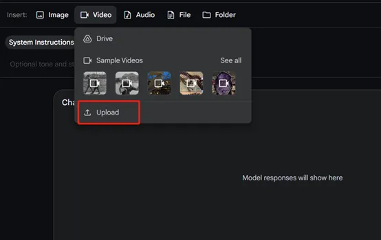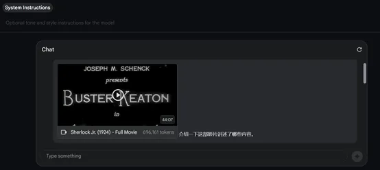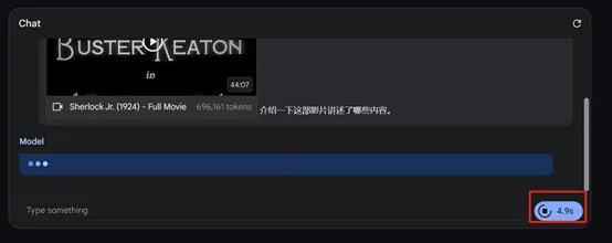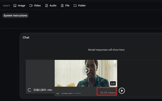 3)由于模型对上传视频的解析速度过慢,所以,这里直接使用了谷歌内置的视频示例。需要注意的是,上传视频不要超过100万tokens。