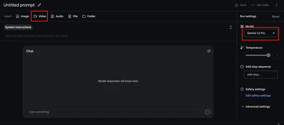 1)登录https://aistudio.google.com/app/prompts/new_chat然后选择模型Gemini 1.5 Pro,以及上方的Video功能。