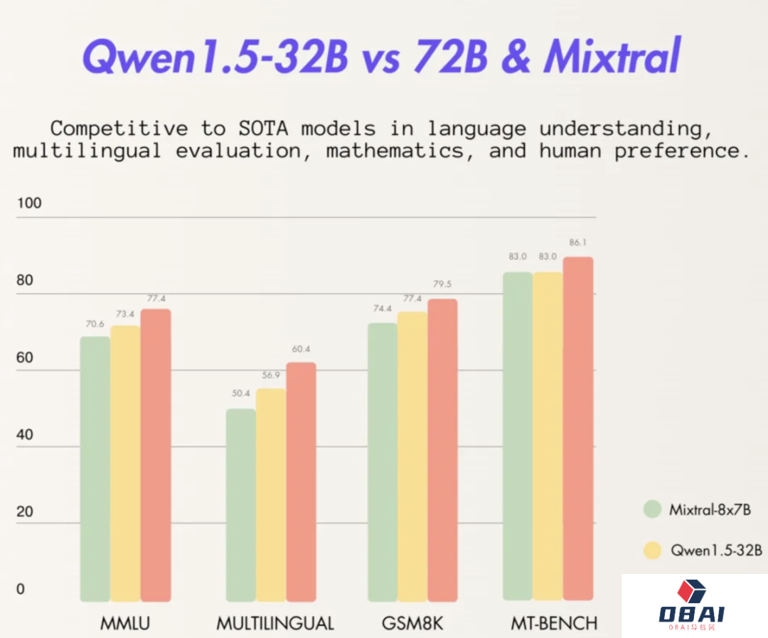 基础能力方面,通义千问320亿参数模型在MMLU、GSM8K、HumanEval、BBH等多个测评中表现优异,性能接近通义千问720亿参数模型,远超其他300亿级参数模型。