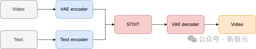 具体来说,整个架构包括一个预训练好的VAE,一个文本编码器,和一个利用空间-时间注意力机制的STDiT(Spatial Temporal Diffusion Transformer)模型。