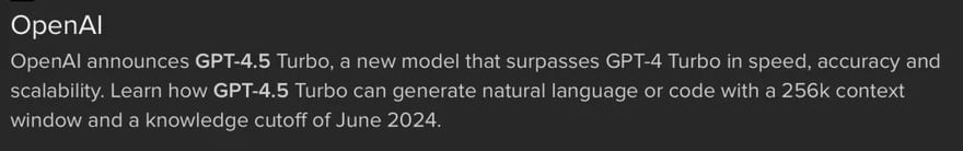 网友发现GPT-4.5 Turbo的信息疑似在搜索引擎上被提前泄露,谷歌、微软必应、DuckDuck Go等搜索引擎已对GPT-4.5 Turbo产品页面建立了索引。从搜索引擎中看到一些产品的简介文字,称 GPT-4.5 Turbo 是 OpenAI 「迄今为止最快、最准确、最具可扩展性的模型」。