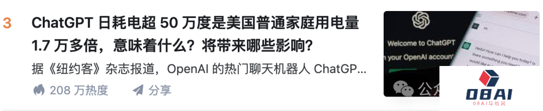 除了微博,#ChatGPT日耗电超50万度#的消息也在知乎冲上热榜第三。