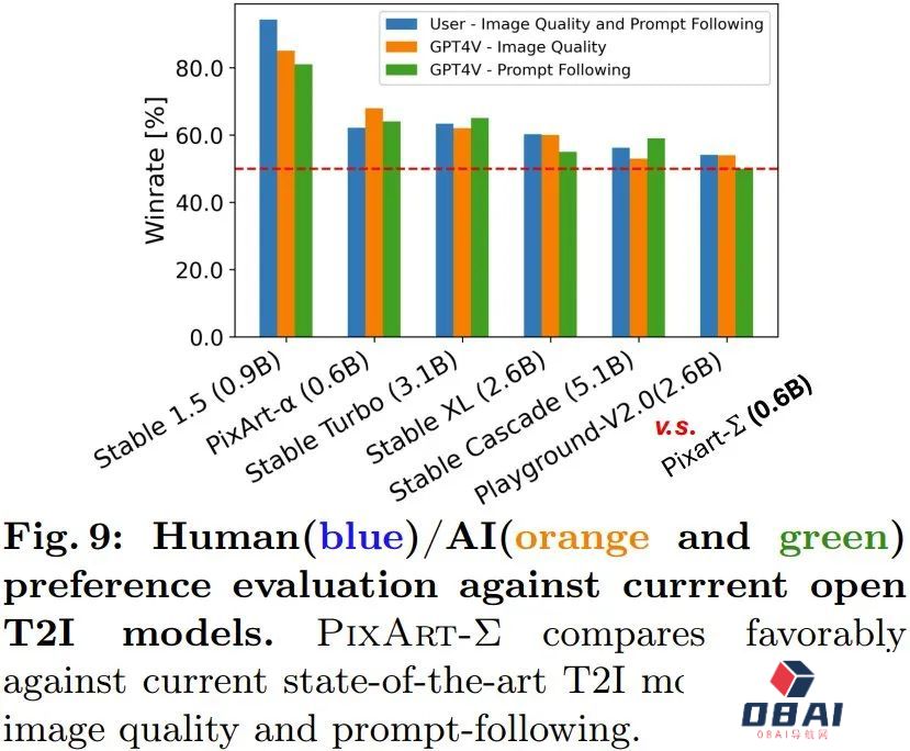 此外,该团队还使用了先进的多模态模型 GPT-4 Vision 来执行 AI 偏好研究。他们的做法是给 GPT-4 Vision 提供两张图像,让它基于图像质量和图像 - 文本对齐程度进行投票。结果见图 9 中的橙色和绿色条形图,可以看到情况与人类评估基本一致。